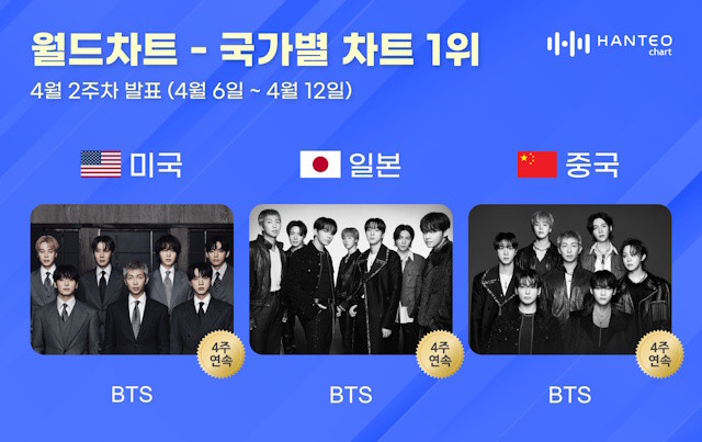세계 유일의 실시간 음악차트인 한터차트는 17일 오전, 4월 2주 차(집계 기간 4월 6일~4월 12일) 미국, 일본, 중국 국가별 차트 TOP 30을 발표했다.