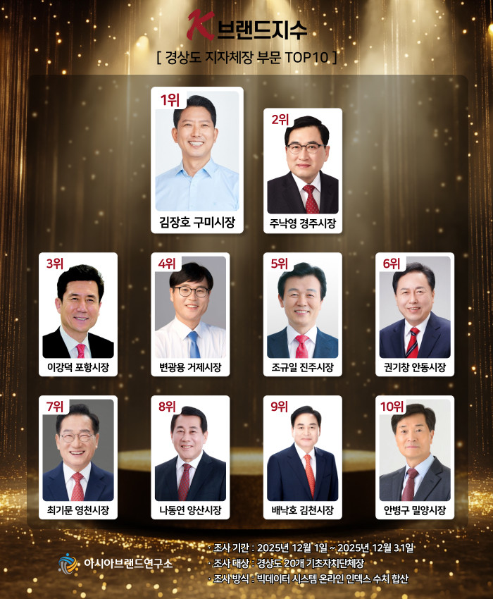 한정근 아시아브랜드연구소 대표는 “이번 K-브랜드지수 올해의 경상도 지자체장 부문은 단기간 이슈보다 누적된 현안 대응과 온라인 노출 흐름이 순위에 반영된 것으로 볼 수 있다”며 “김장호 구미시장의 1위 등극은 산업·지역 이슈에 대한 지속적 IMC 활동이 실질 효과를 발휘한 것으로 해석된다”라고 설명했다.