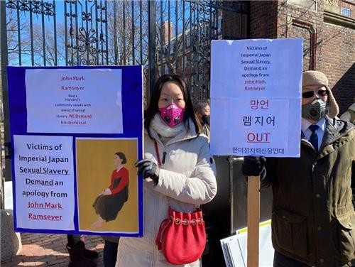 | ▲ 하버드대 앞에서 개최된 램지어 규탄 집회 (사진 : 케임브리지=연합뉴스) |