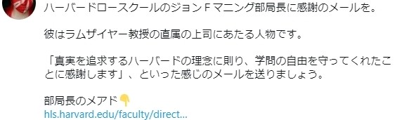 | ▲ 하버드대 로스쿨 학장에게 감사 이메일을 보내자는 넷우익의 글 (사진 : 트위터 캡처) |