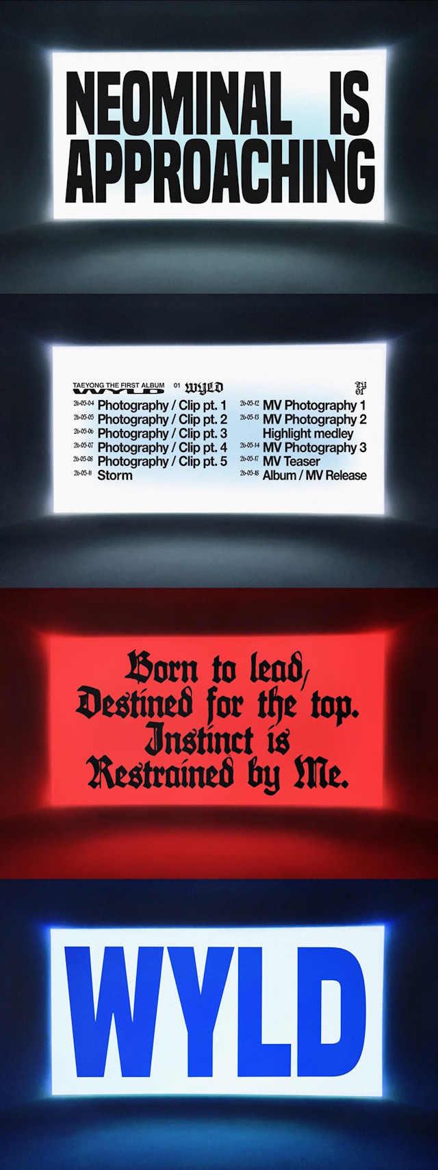 28일 0시 NCT 각종 SNS 채널에 공개된 태용 정규 1집 스케줄 포스터는 앨범명 ‘WYLD’에 맞춰 압도적인 에너지와 거친 무드 속 다채로운 티징 콘텐츠를 예고하며 시선을 사로잡았다.