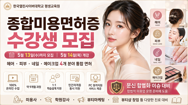 한편 한국열린사이버대학교 평생교육원의 종합미용면허증 과정은 5월 13일까지 모집하며, 5월 14일 개강 예정이다. 수강 신청 및 학습 상담은 한국열린사이버대학교 평생교육원을 통해 확인할 수 있다.