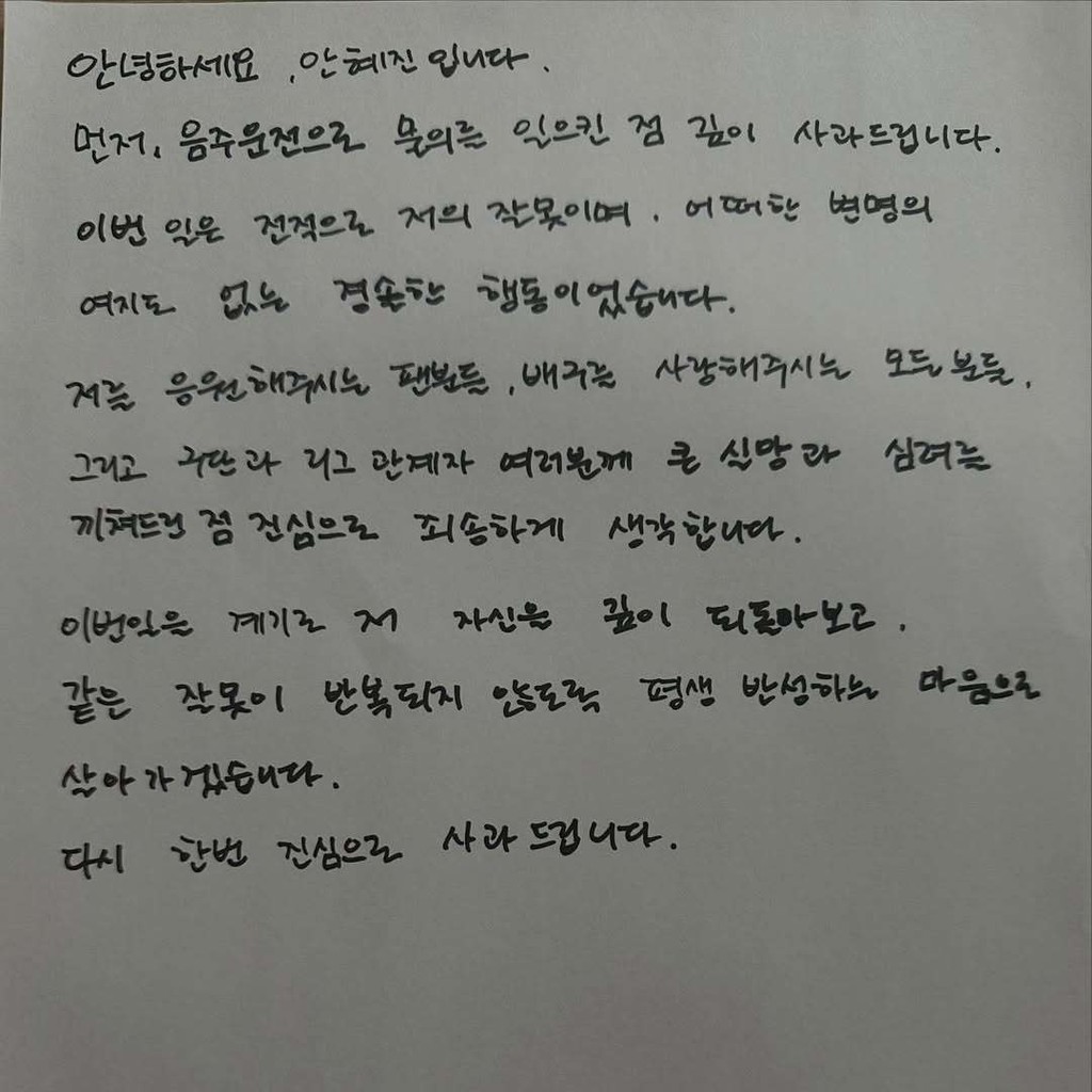 안혜진은 구단이 음주운전 적발 사실을 발표한 뒤 자신의 SNS를 통해 자필로 "물의를 일으킨 점 깊이 사과드리고, 어떠한 변명의 여지도 없는 경솔한 행동"이라며 "이번을 계기로 스스로를 깊이 되돌아보고, 평생 반성하는 마음으로 살아가겠다"고 고개를 숙였다.