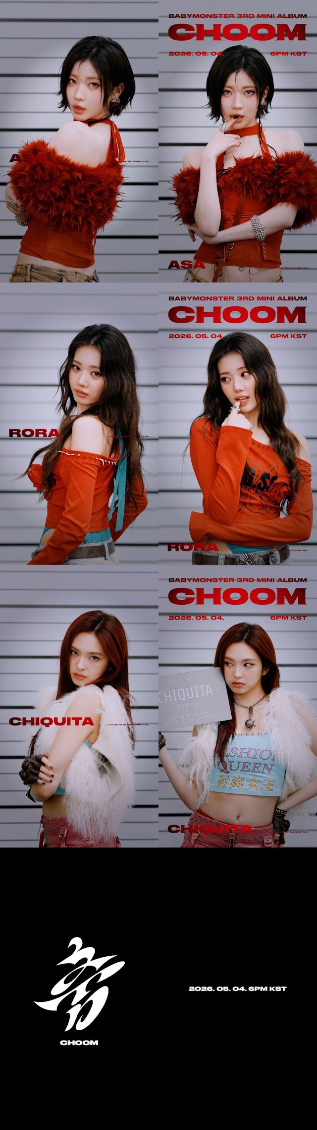 베이비몬스터는 오는 5월 4일 오후 6시 미니 3집 ‘춤 (CHOOM)’을 발매한다. 동명의 타이틀곡 '춤 (CHOOM)'을 비롯해 'MOON', 'I LIKE IT', 'LOCKED IN'까지 총 4개 트랙이 수록됐으며, 힙합·댄스·R&B 등 다채로운 장르로 베이비몬스터의 변화무쌍한 매력을 만나볼 수 있을 전망이다.