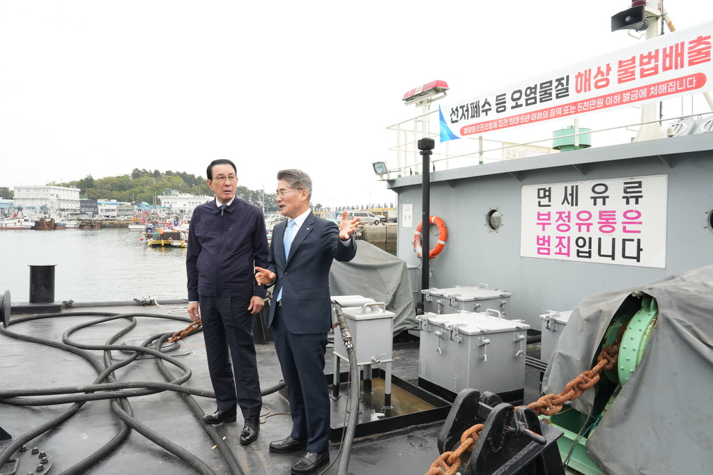 | ▲ 지난 17일 노동진 회장(왼쪽)과 정도근 삼천포수협 조합장이 삼천포수협 급유부선(바지선)을 방문해 면세유 수급 현황을 점검했다. [사진=수협] |