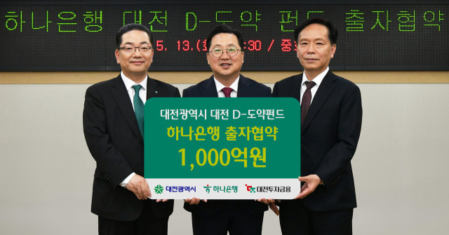 [SWTV 김성인 기자] 하나은행은 지난 13일 오후 대전시청에서 대전시, 대전투자금융과 함께 지역 스타트업 혁신 성장 지원 및 벤처투자 생태계 활성화를 위해 '대전 D-도약펀드'에 1000억원을 출자하는 협약을 체결했다고 14일 밝혔다.