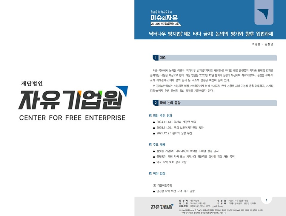 자유기업원은 “닥터나우 방지법 논란이 ‘먼저 막고 나중에 생각하는’ 입법 관행을 바꾸는 계기가 되어야 한다”며 “혁신을 선제적으로 봉쇄하는 규제가 아닌, 투명성과 사후책임을 통해 시장과 소비자가 스스로 선택할 수 있는 환경을 만드는 것이 진정한 보호다”라고 말했다.