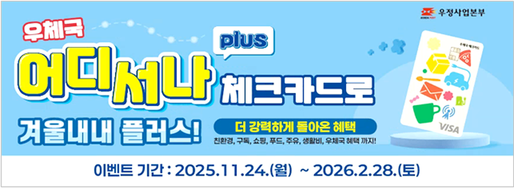 [SWTV 이정우 기자] 우정사업본부는 24일 우체국 체크카드 베스트셀러인 ‘어디서나’ 카드의 혜택을 최신 트렌드에 맞춰 리뉴얼한 ‘어디서나plus’ 체크카드 출시하고 내년 2월28일까지 ‘겨울내내 플러스! 새단장 이벤트’를 진행한다고 밝혔다.